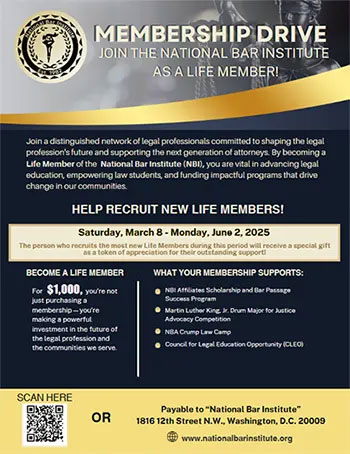 As we welcome the New Year, sincere thanks to our sponsors, members, and associates for driving the National Bar Institute’s mission. Your steadfast commitment fuels our success. To our members, your enduring support is invaluable. Welcoming new members in 2025 adds fresh energy to our cause. Thanks to all for contributing to our 2024 accomplishments. The Board of Directors anticipates a greater impact on the African American community and the legal profession.